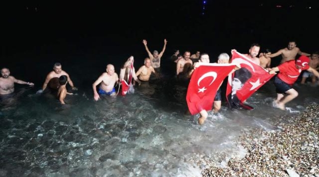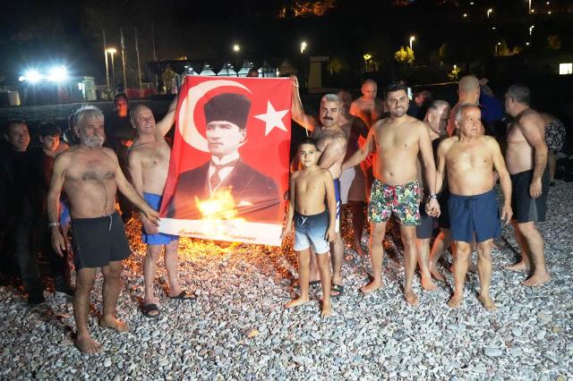 Gece saatlerinde Konyaaltı Sahili’nde bir araya gelen yaklaşık 30 kişilik grup, ellerinde Türk bayrakları ve Mustafa Kemal Atatürk’ün posteriyle 10’dan geriye sayarak yeni yılı karşıladı. Saatler gece yarısını gösterdiğinde ise hep birlikte denize girerek 2025’in ilk dakikalarını denizde geçirdi.
