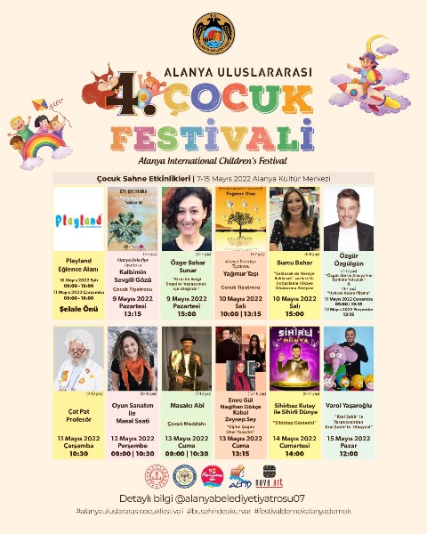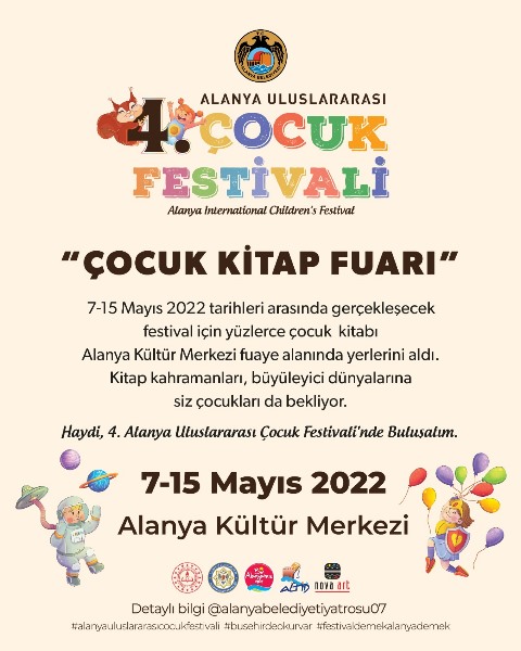 Alanya Belediye Kültür Merkezi’nde gerçekleşecek olan festivalin açılışı ise Alanya Belediye Başkanı Adem Murat Yücel’in de katılımı ile 9 Mayıs Pazartesi, saat 09.30’da gerçekleştirilecek. Hafta sonu yapılacak olan seminer programlarının ardından çocuk kitap fuarı, çocuk etkinlikleri, yazarlar ile buluşma, söyleşiler, çocuk tiyatroları, kukla performansları, sahne gösterileri, geleneksel çocuk oyunları, çeşitli yarışmalar ile festival 15 Mayıs’a kadar devam edecek.