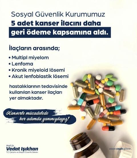 Çalışma ve Sosyal Güvenlik Bakanı Vedat Işıkhan, sosyal medya hesabından yaptığı paylaşımda, "Sosyal Güvenlik Kurumu’muzun (SGK) düzenlemesiyle 5 kanser ilacını daha geri ödeme listesine aldık. İlaçların hastalarımıza şifa olmasını temenni eder, vatandaşlarımıza sağlıklı bir ömür dilerim" ifadelerini kullandı. Bakan Işıkhan'ın paylaşımında yer verdiği görselde, ilaçların arasında multipl miyelom, lenfoma, kronik miyeloid lösemi ve akut lenfoblastik lösemi hastalıklarının tedavisinde kullanılan kanser ilaçları olduğu bilgisi yer aldı. – İHA