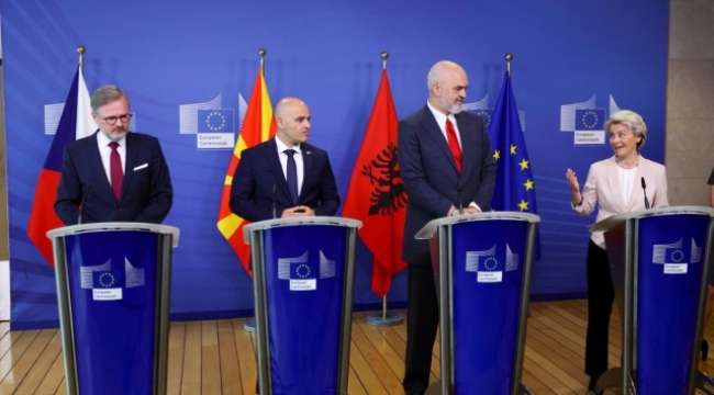 Avrupa Komisyonu Başkanı Ursula von der Leyen, Belçika'nın başkenti Brüksel'de Arnavutluk Başbakanı Edi Rama, Kuzey Makedonya Başbakanı Dimitar Kovacevski ve AB Dönem Başkanı Çekya'nın Başbakanı Petr Fiala ile bir araya geldi. Liderler, görüşmenin ardından ortak basın toplantısı için kamera karşısına geçti. AB Komisyonu Başkanı Von der Leyen, "Bugün, Arnavutluk ve Kuzey Makedonya, AB ile katılım müzakerelerini başlattı. Bu tarihi an sizin başarınızdır. Sıkı çalışmanızın bir sonucu. Avrupa Komisyonu sizi sonuna kadar destekledi, desteklemeye devam edeceğiz" ifadelerini kullandı.