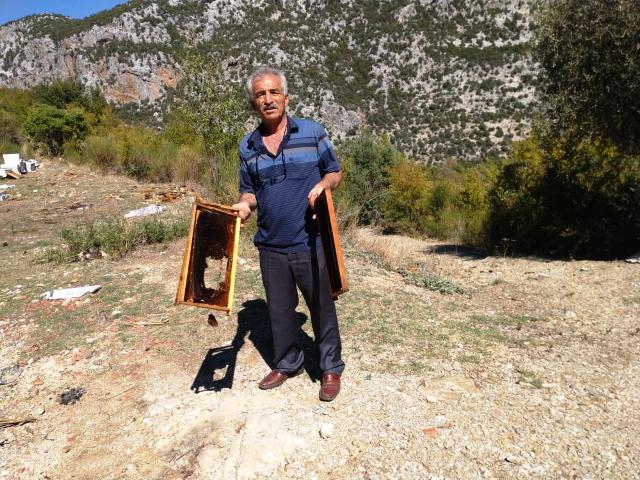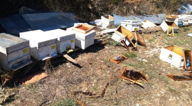 İbradı’da aç kalan ayılar kovanları parçaladı. Üretici Zülküf Öztürk, “75 kovandan bir tane sağlam kovan yok” derken, diğer üretici Mesut Şanlı ise, “Sağlam kovan yok. Arılar ölmüş. En az 150 bin lira zararım var” diye konuştu.