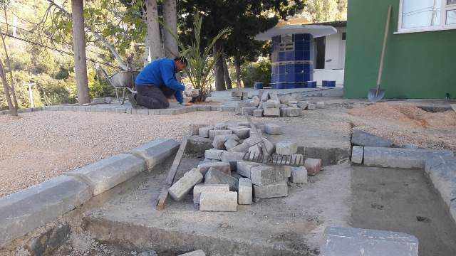 Alanya Hizmet Birimi’ne bağlı parke ekipleri, caminin 90 metrekarelik bahçesine parke döşeyerek çevre düzenlemesine başladı.
