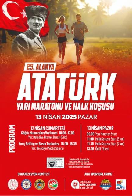 Türkiye’de Atatürk adıyla düzenlen tek uzun yol Koşusu olan ‘Alanya Atatürk Yarı Maratonu ve Halk Koşusu'nun 25’incisi bu yıl 13 Nisan Pazar günü gerçekleştirilecek.