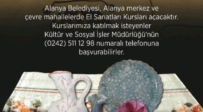 Birer kültürel miras olan el sanatlarımızın aslına uygun olarak öğretilip yaşatılması ve gelecek kuşaklara aktarılmasını sağlamak amacıyla Alanya Belediyesi tarafından açılan kurslara her yıl ilgi daha da artıyor. Alanya Belediyesi Kültür ve Sosyal İşler Müdürlüğü bünyesinde Alanya merkez ile doğu ve batı mahallelerimizde açılacak kurslara katılmak isteyen vatandaşlar başvurularını yapmaya başladı.