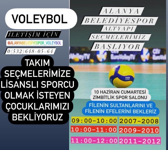 Alanya Belediyespor yarın (10 Haziran 2023 Cumartesi) Zimbitlik Spor Salonu'nda voleybol altyapı seçmelerini gerçekleştirecek.