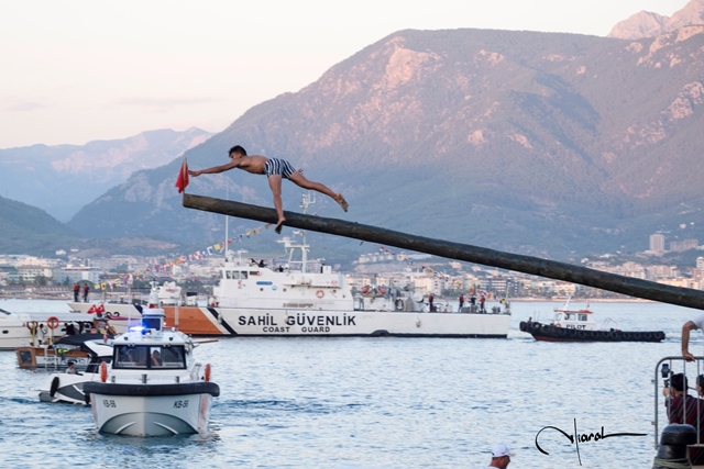 Kutlamaların vazgeçilmezi yağlı direk yarışması, protokol ve vatandaşlardan büyük ilgiyle karşılandı. Yaklaşık 50 kişi, direğin uc kısmındaki Türk bayrağını almak için kıyasıya performans sergiledi. Yarışmayı, 18 yaşındaki Cihan Toros kazandı. Katılımcıların her birine çeşitli işletme ve firmalar tarafından hediyeler verilirken, şampiyon genç Toros'a, Kaymakam Fatih Ürkmezer ile Belediye Başkanı Osman Tarık Özçelik, ipek dokuma Alanya Kuşağı'nı takdim etti. Programın sunuculuğunu yapan isimlerden olan Alanya’nın yaşayan efsanelerinden Oğuz Korum’a da Kaymakam Ürkmezer ve Belediye Başkanı Özçelik tarafından teşekkür plaketi takdim edildi.