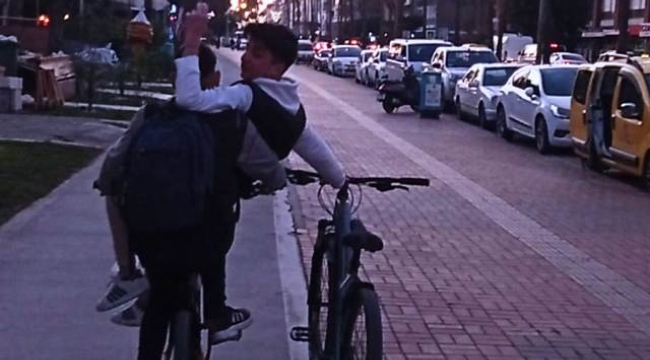 Alanya’daki ilginç görüntü dün saat 18.30 sıralarında Atatürk Caddesi’nde çekildi. Bisikletinin arka lastiği patlayan bir gencin imdadına diğer bisikletli arkadaşı yetişti. Yardımsever genç bisikletinin lastiği patlayan arkadaşını kendi bisikletinin önüne bindirirken, mağdur arkadaşı ise bu sırada eliyle kendi bisikletini tuttu. Gençler bu şekilde sahildeki bisiklet yolundan Alanya merkeze ilerlerken arkadaşının yardımına koştuğu mağdur genç ise bisiklet üzerinde adeta keyiflenmişçesine sigara içmeyi sürdürdü. Gençlerin yolculuğu bisiklet yolundaki başka bir bisikletli tarafından cep telefonu kamerası ile kaydedildi. Görüntüde arkadaki bisikletli vatandaşın, “Oğlum, neden binmiyorsun? Binsene” sözlerine mağdur genç, “Arka lastik patlak” diye cevap verdi. Bu sırada lastiği patlayan genç bisiklet üzerinde keyiflenmişçesine sigara içmeyi sürdürdü. Görüntüleri izleyen bazı vatandaşlar, “Abi, ben de özgüvenden istiyorum” yorumunda bulundu. – Erkan Uysal