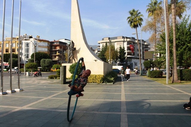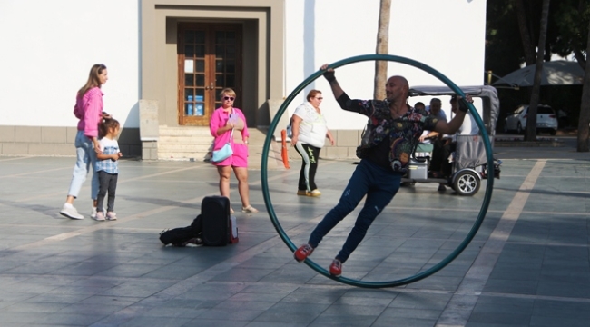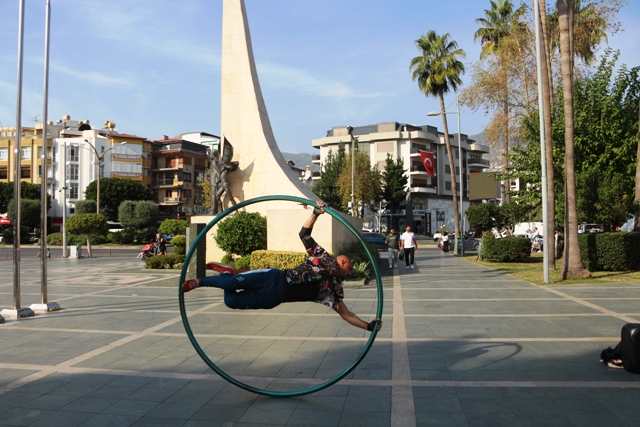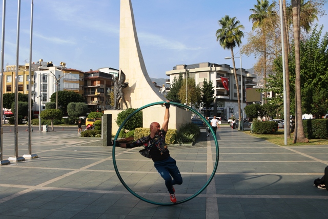 Alanya’da çember ile akrobatik hareketler yapan kişi vatandaşlar ve turistlerden ilgi gördü.