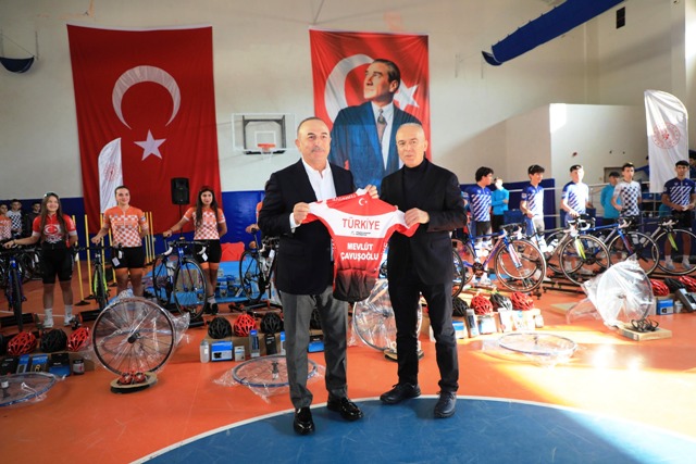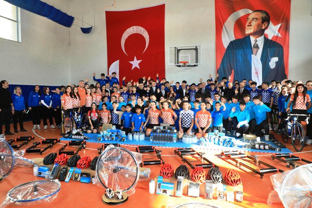 Spor anlamında da okullarımızı desteklememiz lazım. İlçemizden birçok sporcu ve spor adamı çıktı. Yine çıkmaya devam edecek. Evlatlarımıza destek olmak amacıyla ilerleyen tarihlerde Mevlüt Çavuşoğlu Spor Lisemizin yanına uluslararası düzeyde 5 bin kişilik kapalı spor salonu yapacağız. Ayrıca okçuluk ile ilgili bir tesiside Alanya'mıza kazandıracağız. Tüm spor takımlarımızı ve sporcularımızı desteklemeye devam edeceğiz" dedi. Konuşmaların ardından Türkiye Bisiklet Federasyonu Başkanı Emin Müftüoğlu ve öğrenciler tarafından Mevlüt Çavuşoğlu'na hediye takdim edildi. Program sonunda öğrencilere spor malzemeleri dağıtılarak hatıra fotoğrafı çekildi. – Alanya Kaymakamlığı / Bülten