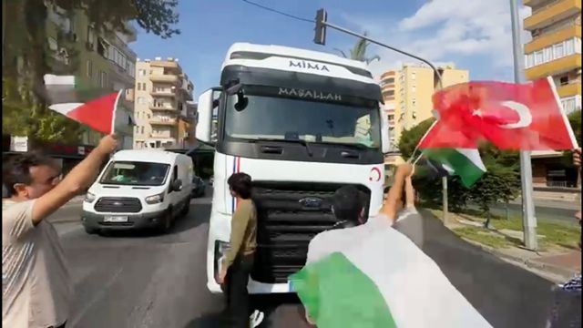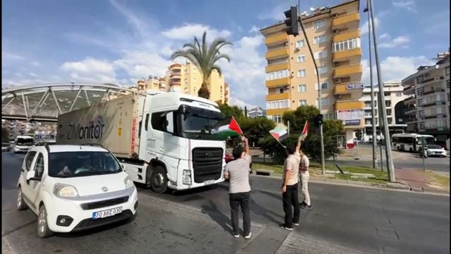 Alanya’da İsrail’in Filistin’e yönelik saldırılarına lojistik destek verdiği iddia edilen bir şirketin TIR’ı Anadolu Gençlik Derneği (AGD) Alanya Şubesi tarafından protesto edildi. AGD Alanya yetkilileri, İsrail’e lojistik destek sağladığını iddia ettikleri firmanın TIR’ına karşı tepkilerini dile getirdiklerini belirtti. Protesto sırasında TIR’ın önünde toplanan dernek üyeleri, ellerinde Filistin bayraklarıyla ve ‘İsrail’le ticaret Filistin’e ihanet’ sloganıyla tepki gösterdi. – Haber Merkezi