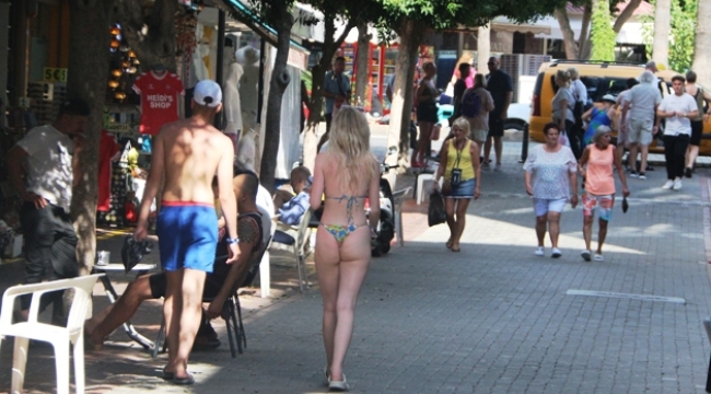 Alanya'da geçtiğimiz aylarda ilçe merkezinde mayo ile dolaşan turist vakalarına bir yenisi daha eklendi. Sıcak havanın etkisinin sürdürdüğü Alanya’da turistler halen denize girmeye devam ediyor. Alanya’da denize girmesinin ardından öğle saatlerinde mayo giyen bir kadın turist ilçe merkezinde gezmeye başladı. Yanında sadece şort giyen eşi ile birlikte gezen mayolu kadın turisti görenler durumu saygısızlık olarak değerlendirdi. Vatandaşlar sahil bölgesi dışında giyim kurallarına daha çok özen gösterilmesini istedi. – Haber Merkezi