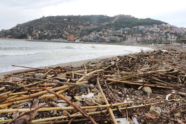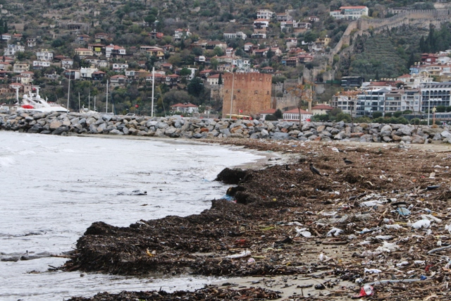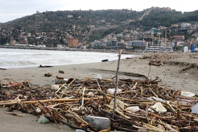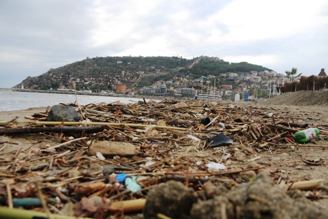 Alanya’da hafta sonu etkili olan sağanak yağışın ardından dereler ile denize ulaşan atıklar kıyılarda birikerek kirliliğe neden oldu. Bazı vatandaşlar ve turistler sahildeki kirliliğe aldırış etmeden kumsalda yürümeyi tercih etti.