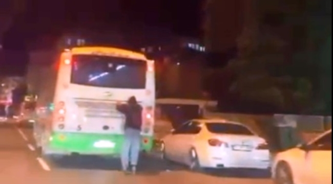 Alanya’da seyir halindeki belediye otobüsüne tutunarak ilerleyen bir gencin tehlikeli yolculuğu, cep telefonu kamerasıyla anbean kaydedildi.