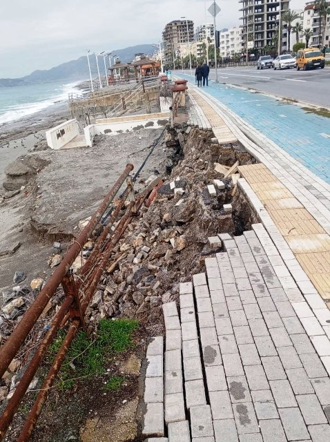Alanya’da metrekareye 124 kilogram yağış düşmesinin ardından Mahmutlar Dörtyol Mezarlığı sahil yolu üzerinde bulunan kaldırım çöktü. Sabah saatlerinde bölgeden geçen vatandaşlar ve sürücüler çöken kaldırımı görünce şaşkınlığını gizleyemedi. Mahalle halkı olası can kaybı ya da yaralanma vakası ile kaldırımda tekrar çökme yaşanmaması için Alanya Belediyesi yetkililerine önlem alınması ve onarım yapılması çağrısında bulundu. – Erkan Uysal
