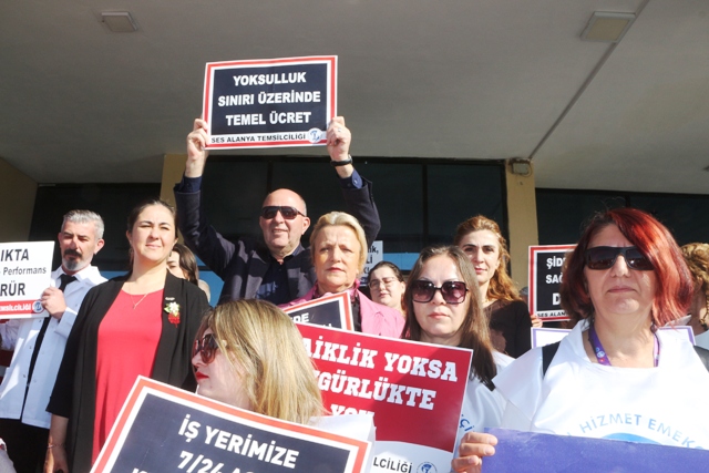 Alanya’da sağlık çalışanları taleplerinin karşılanması amacıyla greve gitti. 3 sendikanın destek verdiği grevde sağlık çalışanları adına konuşan SES Alanya Temsilciliği Üyesi, Pataloji Uzmanı Bahar Bakır Çetin, “Bizler de bugün çoşkulu kutlamalar yapmak isterdik. Bu özel günü eylemler ile karşılamak istemezdik. Fakat sorunlarımız gün geçtikçe katmerleşiyor. Bu sistem hizmeti üreten biz sağlık emekçilerinden ve hizmeti alan parçası olduğumuz halkın yararına değil” dedi.