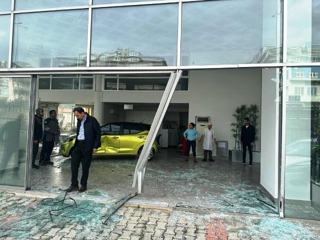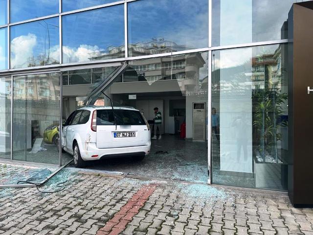 Alanya’da şerit ihlali yaptıktan sonra direksiyon hakimiyetini kaybeden sürücü, otomobil satışı yapan mağazaya girdi.