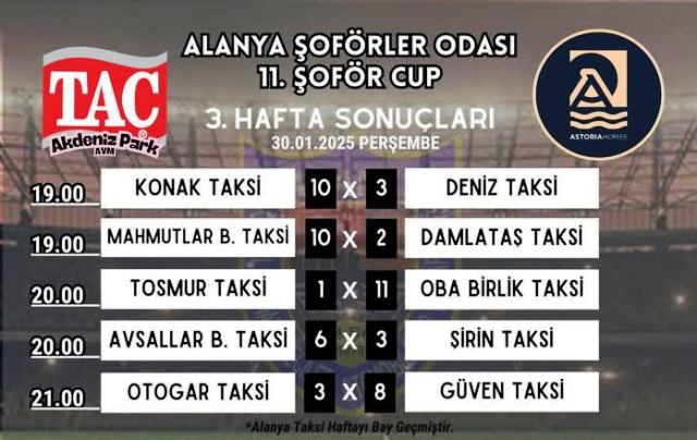 Konaklı Mahallesi’ndeki Özkan Spor Halı Saha’daki turnuvanın 3. haftasında takımlar kıyasaya mücadele etti. Turnuvada Kırmızı Grup’taki maçlardan birisi olan karşılalmada Oba Birlik Taksi, Tosmur Taksi’yi 11-1 yendi. Diğer bir maç ise Otogar Taksi ile Güven Taksi arasında oynandı. Maçı Güven Taksi kazandı. Grubun son maçında ise Konak Taksi, Deniz Taksi’yi 10-3’lük skorla geçti.