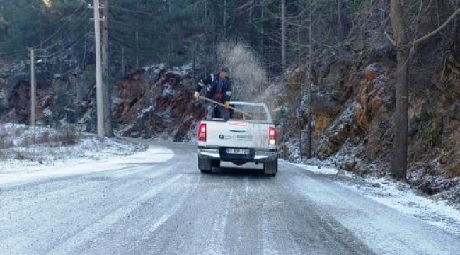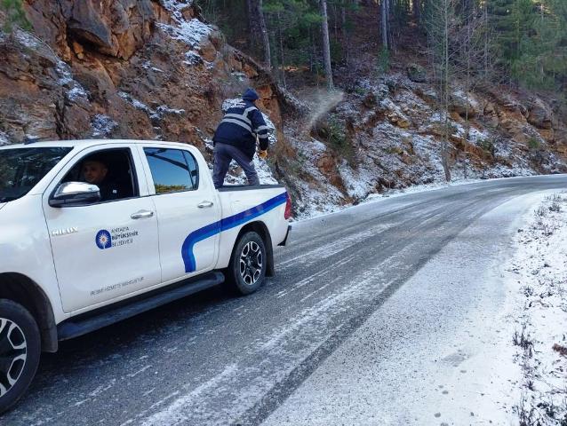 Büyükşehir ekipleri, yüksek kesimlerde tuzlama çalışması başlattı. Alanya ve çevresinde hafta sonu etkili olan yağış ve fırtına sonrası yüksek kesimlerdeki yollarda buzlanma meydana geldi. Antalya Büyükşehir Belediyesi ilçenin kırsal mahalleleri ve yaylalarına ulaşımı sağlayan ana arterleri açık tutmak için çalışıyor. Hafta sonu kar yağışının kendisini gösterdiği Gedevet Yaylası Yolu’nda yağış sonrası buzlanma yaşandı. Araçların ulaşımda sorun yaşamaması için Antalya Büyükşehir Belediyesi Kırsal Hizmetler Dairesi Başkanlığı Alanya ekipleri bölgede tuzlama çalışma yaptı. Ekipler, yolların açık kalması için gün boyu tuzlama çalışmalarını sürdürüyor. – İHA