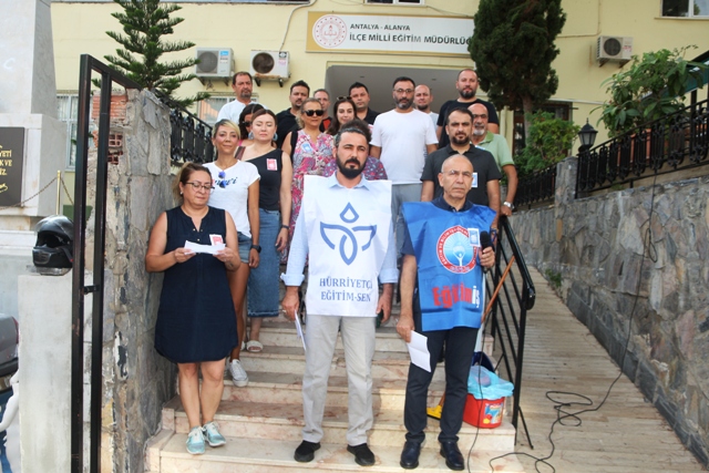 Eğitim-İş ve Hürriyetçi Eğitim-Sen Alanya Temsilciliği, okullardaki temizlik ve güvenlik personeli eksikliklerine dikkat çekmek için İlçe Milli Eğitim Müdürlüğü önünde açıklama yaptı. Eğitim İş Alanya Şube Başkanı Hüseyin Zeybek, “Eğitimde tasarruf olmaz” darken, Hürriyetçi Eğitim Sen Alanya Şube Başkanı Birkan Şam, Milli Eğitim Bakanı Yusuf Tekin’in istifasını istedi.