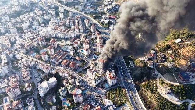 Alanya'daki otel inşaatı yangınının başladığı anlar dron kamerasında