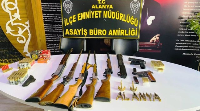Alanya Emniyeti’nin 21 adrese yönelik eş zamanlı olarak düzenlediği operasyonda ruhsatsız av tüfekleri, tabancalar ve yüzlerce mühimmat ele geçirildi. Operasyonda 21 yıl hapis cezasıyla aranan 1 hükümlü dahil olmak üzere, çeşitli suçlardan aranan hükümlüler yakalandı.