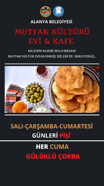 Geçtiğimiz dönemde kafesi hizmet vermeye başlayan ve Alanya’nın yöresel pek çok yiyeceği ve içeceğine erişim imkanı veren Mutfak Kültür Evi şimdi mutfağı ile de ziyaretçileri karşılıyor. Haftanın 3 günü (Salı-Çarşamba ve Cumartesi) Alanya’nın değişmez lezzetlerinden pişi ziyaretçilere sunulacak. Her Cuma ise Alanya’nın en özel yemeği olan Gülüklü Çorba yerli ve yabancı ziyaretçilere sunulacak. Oldukça uygun fiyatlarla tüm vatandaşlar, Alanya’nın yöresel lezzetlerini tadabilecek.