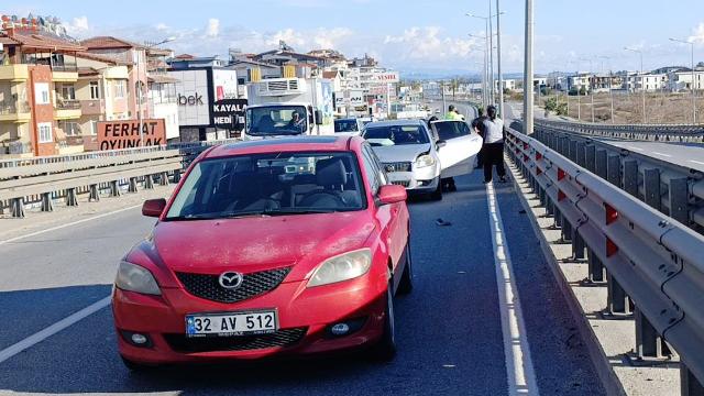 Edinilen bilgiye göre, Alanya-Antalya D-400 Karayolu’nda Alanya istikametinden Antalya istikametine seyir halindeki Salih Ç.’nin kullandığı 07 ST 742 plakalı otomobil, Sorgun-Otogar Köprülü Kavşağı üzerine geldiğinde bilinmeyen bir nedenle stop etti. Salih Ç., otomobilinden inerek hiçbir önlem almadan tek başına aracını iterek yoluna devam ederken, diğer araç sürücüleri için büyük tehlike oluşturdu. İhbar üzerine olay yerine gelen Manavgat Emniyet Müdürlüğü Trafik Denetleme Büro Amirliği ekipleri yolda önlem almasına rağmen tek şeride düşen yolda, önce Ahmet Mert’in kullandığı 32 AAR 623 plakalı otomobil ile Şerife Sülek’in kullandığı 32 AV 512 plakalı otomobil çarpıştı. Trafik ekipleri kaza yapan sürücülerle ilgilendiği sırada bu kez yaklaşık 100 metre uzaklıkta Mehmet Öztürk’ün kullandığı 06 GF 1355 plakalı otomobil ile Hüseyin Tunç’un kullandığı 07 APM 913 plakalı otomobil çarpıştı. Kazalarda şans eseri yaralanan olmazken, köprülü kavşakta kaza yapan araçların çekilmesinin ardından trafik normale döndü. Ekipler, arızalanan otomobilin sürücüsüne önlem almadan karayolunda bekleme yapmaktan 993 TL para cezası uyguladı. – İHA