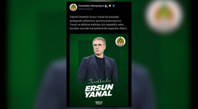 Corendon Alanyaspor Kulübü, teknik direktör Ersun Yanal ile yollarını ayırdığını sosyal medya hesaplarından yaptığı paylaşımla duyurdu.