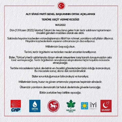 "Dün (13 Kasım 2022) İstanbul Taksim’de meydana gelen hain terör saldırısını toplantımızın öncelikli gündem maddesi olarak ele aldık. Saldırıda hayatını kaybeden vatandaşlarımıza Allah’tan rahmet, yaralılara acil şifalar diliyoruz. Hayatını kaybedenlerin sayısının artmaması için dua ediyoruz. Milletimizin başı sağ olsun. Terörü, terör örgütlerini ve terörden medet umanları lanetliyoruz. Bizler, Türkiye’yi terör saldırılarıyla dizayn etmek isteyenlere karşı kararlı duruşumuzdan asla taviz vermeyeceğiz. Terör örgütlerinin amaçlarına ulaşmalarına hiçbir koşulda müsaade etmeyeceğiz. Terörle mücadelenin hukuk devletinin en öncelikli görevlerinden birisi olduğu inancındayız. Bu mücadele sonuç alana dek sürdürülmelidir. Bizler sorumluluğumuzun bilincindeyiz ve kararlıyız. Milletimizin barış, huzur ve güven ortamında yaşaması hepimizin elindedir. Ülkemizin yarınlarını demokratik bir hukuk devletinde güvenle kuracağız. Bütün zorlukları hep birlikte aşacağız."