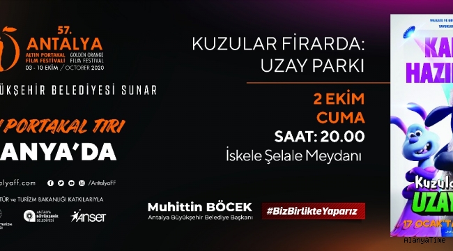 Antalya’nın 19 ilçesinde 25 Eylül 4 Ekim 2020 tarihleri arasında gerçekleştirilecek gösterimlerde bir birinden güzel filmler sanatseverlerle buluşturulacak. Ücretsiz olarak gerçekleştirilecek etkinlikte çocuk filmleri ve komedi filmleriyle küçük yaştan itibaren sinemaya olan ilginin arttırılması hedefleniyor. Altın Portakal Tırı etkinlik kapsamında 2 Ekim 2020 Cuma günü saat 20:00’de Alanya İskele Şelale Meydanı’nda Kuzular Firarda - Uzay Parkı filmini sinemaseverlerle buluşturuyor.