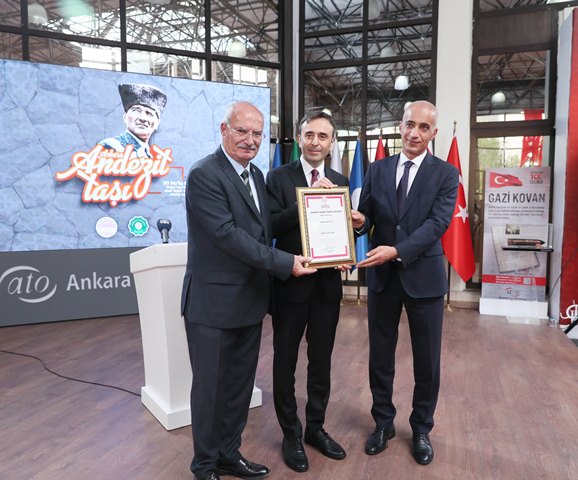 Açılış konuşmalarının ardından Ankara Andezit Taşı’nın tescil sürecine katkı sağlayan Ankara Üniversitesi Gıda Güvenliği Fakültesi Müdürü Prof. Dr. Nevzat Arık, Jeoloji Bölümü Başkanı Prof. Dr. Yusuf Kağan Kadıoğlu, Gıda Güvenliği Fakültesi Müdür Yardımcısı Prof. Dr. Tansel Şileli, Enerji Bakanlığı E. Müsteşar Yardımcısı Nevzat Kavaklı’ya teşekkür plaketleri ATO Başkanı Gürsel Baran, Türk Patent ve Marka Kurumu Başkanı Cemil Başpınar, 30 No’lu Doğal Taş, Mermer ve Hazır Beton İmalatçıları Meslek Komitesi Başkanı Ali İhsan Güçlü tarafından takdim edildi.