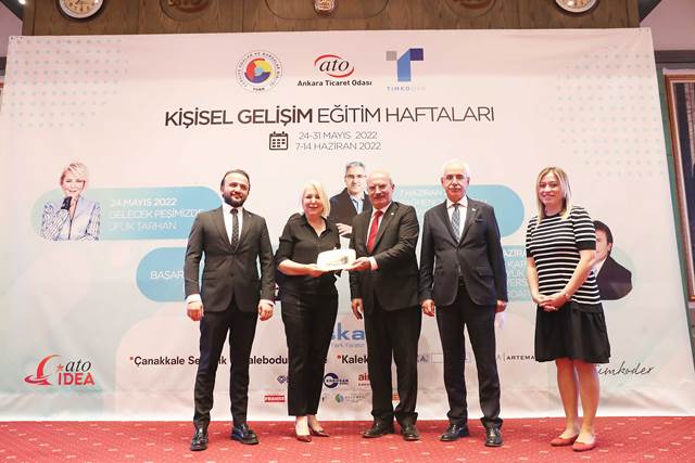 Eğitimin ardından ATO Başkanı Baran, ATO Başkan Yardımcısı Aktay ve TİMKODER Başkanı Ayhan ile birlikte Tarhan’a bir teşekkür plaketi verdi.