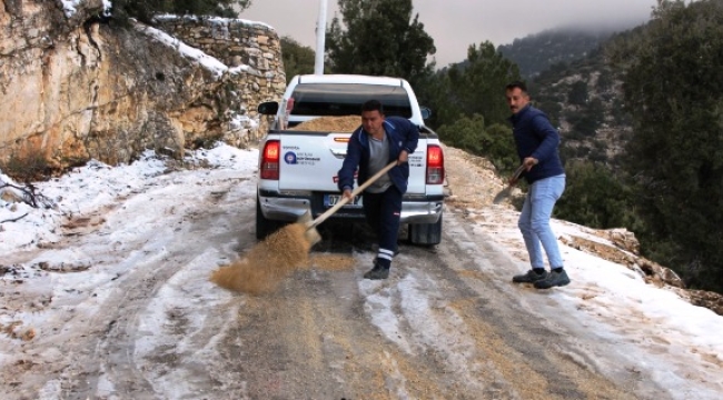 Antalya Büyükşehir Belediyesi, kırsal yollarının trafiğe açık kalması için yoğun bir şekilde çalışıyor. Ekipler soğuk hava nedeniyle Alanya’da buzlanma meydana gelen yollarda tuzlama çalışması yapıyor.