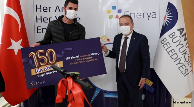 Antalya Büyükşehir Belediye Başkanı Muhittin Böcek, Antalya’nın 150 bininci doğal gaz abonesini kutlayarak, elektrikli scooter hediye etti.