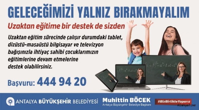 ‘Geleceğimizi Yalnız Bırakmayalım’ Antalya Büyükşehir Belediyesi, uzaktan eğitime destek amacıyla ihtiyaç sahibi öğrenciler için bilgisayar, tablet ve televizyon bağış kampanyası başlattı. ‘Geleceğimizi Yalnız Bırakmayalım’ kampanyasıyla kullanılabilir durumda olan bilgisayar ve televizyonlar hayırsever vatandaşlardan alınarak, uzaktan eğitime erişim sıkıntısı yaşayan öğrencilere ulaştırılacak.