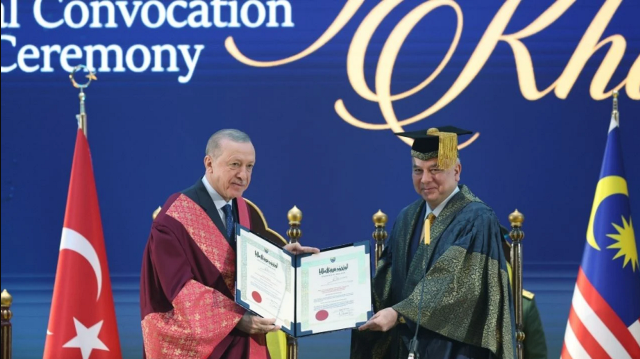 Cumhurbaşkanı Recep Tayyip Erdoğan'a Malezya'da Perak Sultanı Nazrin Şah tarafından uluslararası ilişkiler alanında fahri doktora beratı tevdi edildi.
