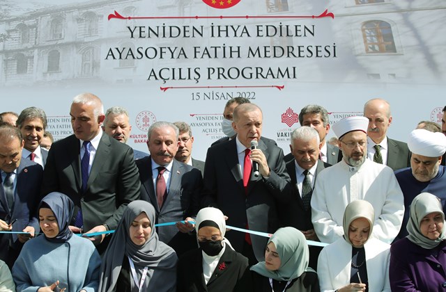 “Ayasofya Fatih Medresesi'nde olduğu gibi; kimi zaman ihmalkarlıktan, kimi zaman gafletten, kimi zaman da rövanşist anlayışla tarihi eserler yıkılmış içerisindeki nice eserler de kaybolup gitmiştir” diyen Cumhurbaşkanı Erdoğan, “Asırlara meydana okuyan yüzlerce cami satılmış, kiraya verilmiş yada depo olarak kullanılmıştır. Kur'an kurslarımız kapatılmış, ilim irfan yuvalarımızın kapısına kilit vurulmuştur. Biz bu açılışta sadece emanete sahip çıkmıyoruz, tek parti zihniyetinin tarihe sürdüğü utanç lekesini ortadan kaldırmanın bahtiyarlığını yaşıyoruz. O dönemki mimari özelliklerine sadık kalınarak ihya edildi. Yaklaşık 4.5 asır boyunca sayısız alimin yetişmesine vesile olan bu medrese yine ilim vermeye devam edecektir. Burada inşallah yarının alimleri yetişecektir. Bu güzide eserin 13 ay gibi bir sürede hayata geçirilmesindeki emeği geçen herkesi tebrik ediyorum. Sultan Fatih'in emanetini ihya ettik” dedi.