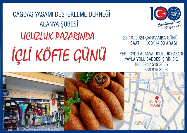 Çağdaş Yaşamı Destekleme Derneği (ÇYDD) Alanya Şubesi tarafından 23 Ekim Çarşamba günü 11.00-14.00 saatleri arasında derneğin Ucuzluk Pazarı’nda içli köfte günü düzenlenecek. ÇYDD Alanya Şubesi tarafından içli köfte gününe tüm vatandaşlar davet edildi. ÇYDD Alanya Şubesi’nin Ucuzluk Pazarı Yayla Yolu, Şirin Sokak’ta bulunuyor. Etkinlik hakkında bilgiler almak isteyenler (0242) 519 36 67 ile 0538 915 39 03 numaralı telefonları arayabilir. – Haber Merkezi