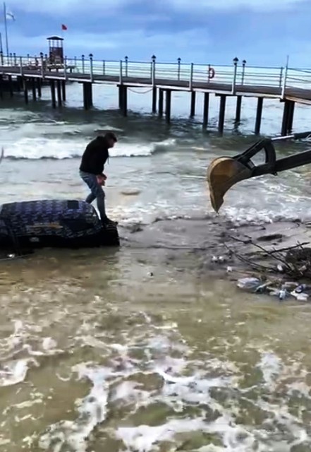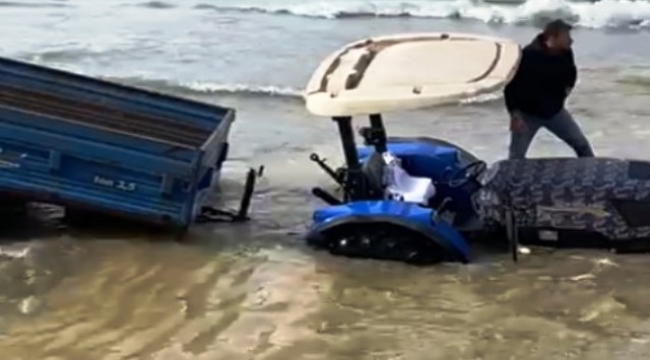 Manavgat'ta dün etkili olan yağmur, su kanalları ve derelerin taşmasına neden olurken, Kumköy Sahilinde dere yatağının derinleşmesi nedeniyle sahilde malzeme taşıyan bir otele ait traktör mahsur kaldı. Sürekli aynı bölgede malzeme taşıdığı belirtilen ve dere yatağının aniden derinleşmesi nedeniyle dere yatağına düşen traktör, iş makinesi yardımıyla uzun uğraşlar sonucunda çıkarıldı. – İHA