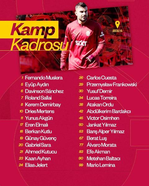 "Fernando Muslera, Eyüp Aydın, Davinson Sanchez, Roland Sallai, Kerem Demirbay, Dries Mertens, Yunus Akgün, Eren Elmalı, Berkan Kutlu, Günay Güvenç, Gabriel Sara, Ahmed Kutucu, Kaan Ayhan, Elias Jelert, Carlos Cuesta, Przemyslaw Frankowski, Yusuf Demir, Lucas Torreira, Atakan Ordu, Abdülkerim Bardakcı, Victor Osimhen, Jankat Yılmaz, Barış Alper Yılmaz, Berat Luş, Alvaro Morata, Efe Akman, Metehan Baltacı ve Mario Lemina." - İHA