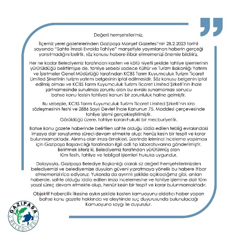 Dolayısıyla, Gazipaşa Belediye Başkanlığı olarak siz değerli hemşehrilerimizden belediyemizi ve belediyemize duyulan güveni yıpratmaya yönelik bu habere itibar etmemenizi rica ediyoruz. Yukarıda da ayrıntılı şekilde açıkladığımız gibi, anılan haberde, sahte olduğu iddia edilen imza incelemesine ve tahliye işlemine dair tüm yasal süreç devam etmekte olup, henüz kesin bir tespit ve karar bulunmamaktadır.