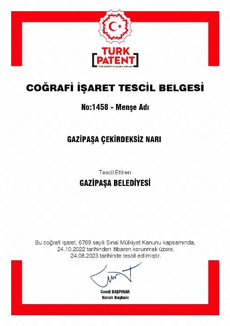 Gazipaşa’da üretilen ve ünü ilçemizde düzenlenen festivalle ülke sınırlarını aşan Gazipaşa Çekirdeksiz Narı’ı, Gazipaşa Belediyesi'nin yürüttüğü yoğun çalışmalar sonucunda Türk Patent ve Marka Kurumu'ndan Coğrafi Tescil İşaret Belgesi aldı. Gazipaşa’nın Çekirdeksiz Nar’ı bu sonuçla Antalya'nın 16. coğrafi işaretli ürünü oldu.