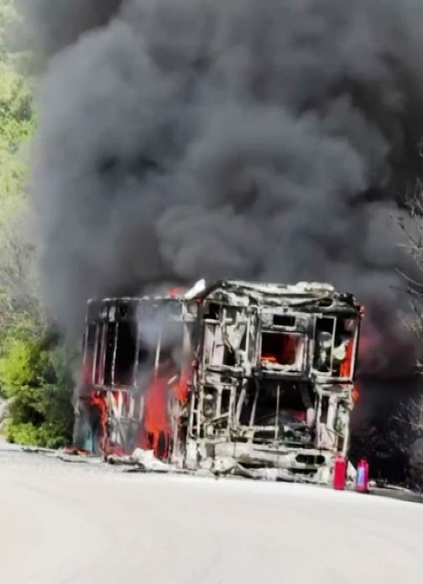 Antalya’da seyir halindeki halk otobüsü alevlere teslim oldu. Yangın sonrası halk otobüsünden geriye demir yığını kaldı.