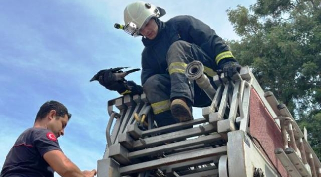 Manavgat’ta ayağına misina dolanıp ağaçta mahsur kalan karga, itfaiye ekiplerince kurtarıldı.