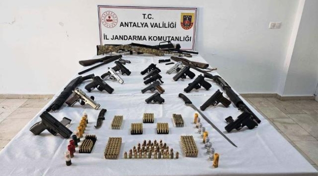 Antalya'da jandarma tarafından 15 adrese yapılan eş zamanlı operasyonda çok sayıda silah ele geçirildi.