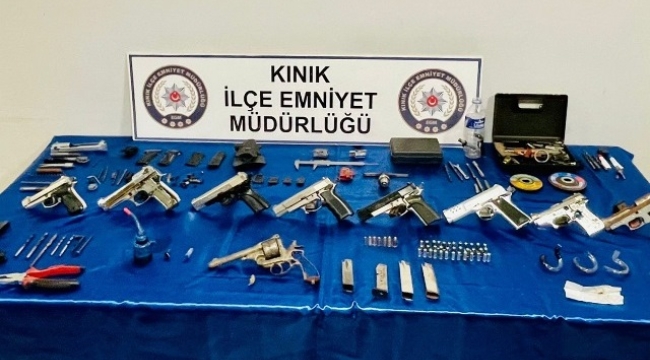 Kınık İlçe Emniyet Müdürlüğü tarafından 2 şüpheli şahsın evinde yapılan aramada, çok sayıda silah ve silah tamir tadilatında kullanılan malzeme ile tabanca mermisi ele geçirildi.