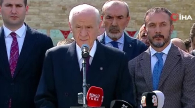 İntikam kuyruğuna girenlere seslendiğini söyleyen Bahçeli, "İntikam alanların en hayırlısı Allah'tır. Bizim yolumuz hak yoludur, hakikat yoludur, Allah'ın yoludur. Devşirilmiş zihniyetlere terk edecek bir ülkemiz dün yoktu, bugün de yoktur. İşbirlikçiliğin kafesine girmiş mandacılara, ihanetin kulvarında peş peşe koşan, bunu da demokrasi ve özgürlük kriteriyle tevil eden köksüzlere ne tarihimizi yargılatırız, ne milletimizi sorgulatırız, ne de devletimizi kirli ellerine bırakırız. Ölürsem şehit kalırsam gaziyim diyen soylu iradeyi hiçbir gücün kıramayacağını, hiçbir saldırının yıkamayacağını, hiçbir zalimin teslim alamayacağını ikazen söylemek ve muhataplarına ilam etmek isterim. Bu aziz vatanın, bu kutlu milletin yalnızca fert fert insanı değil, aynı zamanda nehirleri de gazidir, dağları da kahramandır'' açıklamasında bulundu.