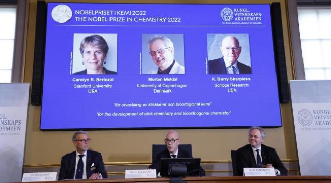 Nobel Kimya Ödülü'nün bu yılki sahipleri belli oldu. 2022 Nobel Kimya Ödülü'nü bu yıl Amerikalı ve Danimarkalı kimyagerler Carolyn R. Bertozzi, Morten Meldal ve K. Barry Sharpless kazandı. Kimyagerlerin, "click kimyasının ve bioortogonal kimyanın gelişimi” nedeniyle ödüle layık görüldüğü kaydedildi.