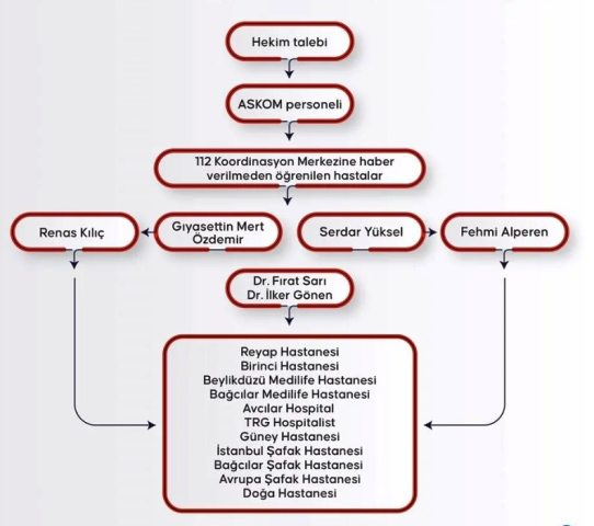Bu işlemlerin ardından önce ASKOM'a, akabinde Kamu Hastaneleri Hizmetleri Başkanlığına durumun iletildiği, 112 Koordinasyon Merkezinden talep oluşturulduktan sonra provizyon numarası alınarak 112 Acil Çağrı Merkezi Müdürlüğüne daha önceden bildirilen ve uygun tedaviyi yapabilecek donanıma haiz özel hastanelere naklin gerçekleştirildiği bildirildi.