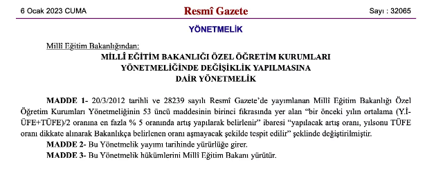 Milli Eğitim Bakanlığı Özel Öğretim Kurumları Yönetmeliğinde Değişiklik Yapılmasına Dair Yönetmelik'te yer alan karara göre yönetmeliğin 53 üncü maddesinin birinci fıkrasında yer alan “bir önceki yılın ortalama (Y.İ-ÜFE+TÜFE)/2 oranına en fazla % 5 oranında artış yapılarak belirlenir” ibaresi kaldırıldı.